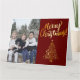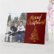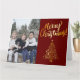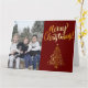 Joyeux Noël jaune doré en caractères de script avec un arbre de Noël abstrait doré posé sur un solide rouge profond dans ce design sophistiqué. Téléchargez votre propre photo de portrait vertical. Message de Noël au verso de la carte en caractères noirs manuscrits et ornement d'un arbre de Noël rouge.