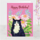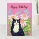 Bonne carte d'anniversaire avec un chat noir et blanc aux cheveux longs. Pour les amoureux de les chats et les propriétaires de chatons !