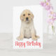 Cette carte d'anniversaire amusante à la canine présente une image d'un chiot jaune Labrador Retriever surligné d'un arrière - plan blanc immaculé et d'un joyeux anniversaire imprimé en caractères rouges gras.