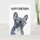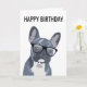 Une drôle de carte d'anniversaire de chien avec un arrière - plan blanc qui peut être changée en n'importe quelle couleur, un bulldog français bleu/gris portant des lunettes, et les mots "heureux anniversaire".