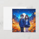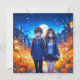 Un couple d'amis se tenant la main la nuit d'Halloween entourée de citrouilles et de lumières de la ville.