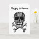 Une carte de vœux comportant un dessin de crâne et d'os fait main avec les mots Joyeux Halloween sur le devant. L'intérieur indique « Que tous vos vœux effrayants se réalisent ».