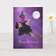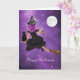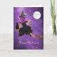 Carte de vœux personnalisée Magique Joyeux Halloween. Le design présente une scène de nuit de pleine lune magique, avec une sorcière volante et un chat noir regardant le ciel violet étoilé. Personnalisez le design avec votre message personnalisé.