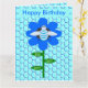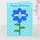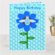 Cette carte d'anniversaire amusante présente une image graphique d'un joli bourdon bleu avec des rayures bleues vives, des yeux noirs, des antennes bleues et des jambes noires. Il a de jolies ailes bleues et blanches. L'abeille est assise au milieu d'un joli tournesol bleu. La fleur a une tige verte et trois feuilles. Le message "Bee Day boy" apparaît sur les trois feuilles. Le arrière - plan est composé d'un motif peigne bleu pâle.