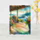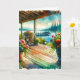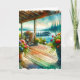 Bonne carte Anniversaire. Jolie transformation d'un pont à l'aquarelle avec des fleurs en pot dans une maison de lac au-dessus de l'eau.