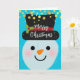 Une jolie carte de voeux Joyeux Noël illustrant l'illustration d'un bonhomme de neige au casquette noir festif et au nez de carotte. Des confettis ronds de neige et d'or se remplissent dans l'arrière - plan. Image, art, et vers © Shoaff Ballanger Studios, 2024.