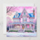 Une jolie carte de Noël avec une maison victorienne rose, un jardin enneigé et un accueil chaleureux.
