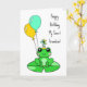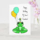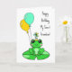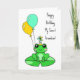 Carte d'anniversaire. Carte d'anniversaire personnalisée avec grenouille mignonne sur un tapis de lis dans un casquette d'anniversaire avec ballons.