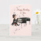 Carte d'anniversaire douce et romantique pour la femme d'un homme de piano portant un tux et fedora casquette jouant "Joyeux anniversaire" sur un piano à queue. Les notes musicales coulent de haut en bas de la carte. À l'intérieur, vous pouvez personnaliser avec le nom de votre femme ou votre nom d'animal de compagnie pour elle.
