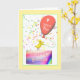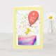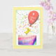 Une carte d'anniversaire mignonne et festive avec ma conception d'un poulet bébé debout sur un gâteau d'anniversaire tenant un ballon qui dit "4 ans !". Verse à l'intérieur.