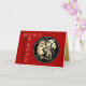 Personnalisé 2020 + Happy + Année du Rat + rat doré et pamplemousse coupé en papier (modèle n°3) dans un cercle noir avec arrière - plan rouge foncé (devant) et image texturée dorée comme arrière - plan (à l'intérieur). Vous pouvez facilement modifier le texte (couleur de police, taille et position) si vous le souhaitez en cliquant sur le bouton personnaliser. Conception sur carte de voeux horizontale. Disponible avec d'autres modèles de découpe de papier de rat.