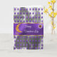 Une carte élégante violette et argentée en feuille caractérisée par une lune de bijou orange avec un charme de cornaline perle dorée, des colliers de coeurs en cornaline dorée et des étoiles violettes brillantes.