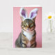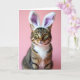 This card features a tabby cat centered on a smooth, pale pink background, wearing oversized bunny ears 🐰. Warm brown, black, and cream stripes ripple through its coat, while a bright white chest patch adds a soft, affectionate contrast. The cat looks straight ahead with wide emerald-green eyes, catching tiny highlights that give it a tender, companionable presence. Long white whiskers sweep outward from its muzzle, like gentle lines reaching toward someone close. The plush ears are white with a light lavender inner lining, tilting slightly to add a sweet, friendly charm 🐇. A short Easter greeting sits near the top in a simple, rounded font, set in a deeper pink that stands out against the background. The lighting is even and soft, showing fine fur texture and a faint shadow under the chin, with the lavender ear interiors clearly outlined.