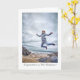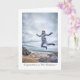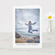 Une carte de voeux comportant une femme sautant pour la joie outre de quelques roches sur une plage. Elle des bras et des jambes sont partiellement tendues, la transformant en crabe sautent. Elle utilise une veste capitonnée contre le froid et ses cheveux se soulèvent dans le vent. Avec une expression heureuse et des yeux au loin, l'impression globale est d'exubérance sauvage.