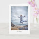 Une carte de voeux comportant une femme sautant pour la joie outre de quelques roches sur une plage. Elle des bras et des jambes sont partiellement tendues, la transformant en crabe sautent. Elle utilise une veste capitonnée contre le froid et ses cheveux se soulèvent dans le vent. Avec une expression heureuse et des yeux au loin, l'impression globale est d'exubérance sauvage.