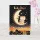Un bébé garçon mignon assis sur une demi-lune jaune vif vêtu d'un costume de nounours contre un fond fort d'un ciel noir et orange rempli de minuscules étoiles. Une lune avec un grand visage humoristique sourit au bébé. En dessous de lui, des maisons et des arbres en silhouette. Une carte adorable pour la première Halloween de bébé.