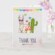 Une carte de remerciement avec une bannière fantaisie sur le dessus. Illustré avec un joli lama portant des lunettes de soleil en forme de coeur. Quelques étoiles, un champignon et un cactus vert complètent l'illustration. Whimsical et mignon. A l'intérieur de la carte se trouvent des points de confettis colorés et un autre mignon lama soufflant une bulle de bubblegum. Message personnalisé à l'intérieur.