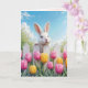 Un lapin blanc curieux pousse la tête sur une clôture blanche, entourée de tulipes vibrantes dans les tons rose et jaune. Le texte peut être modifié.