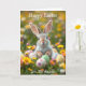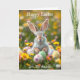 Carte de Pâques personnalisée avec une page de coloriage intérieure. Joli lapin assis dans l'herbe plein de fleurs et d'oeufs de Pâques.