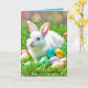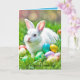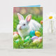 Lapin blanc avec oeufs colorés de Pâques dans l'herbe. Tout le texte peut être modifié.
