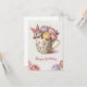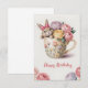 Une carte de vœux d'anniversaire présentant une illustration ludique de style aquarelle d'un minuscule lapin avec un nœud rose vif qui regarde de l'intérieur d'une tasse à café en céramique et de roses délicates de couleur pastel.