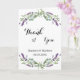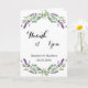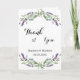 Un arrière - plan blanc, décoré de lavande, de fleurs violettes et de verdure d'eucalyptus. A l'intérieur : 1ère de vos photos mariages, taille verticale. Votre remerciement. Retour : 2ème de vos photos, taille du paysage.