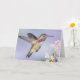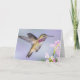 Carte de Sympathie avec un colibri Calliope survolant les fleurs de lantana jaunes et roses, montrant ses ailes complètement étirées dans le dos et ses plumes iridescentes de gorge magenta (gorget). Message intérieur - "Que votre coeur et votre âme trouvent paix et confort." Belle carte pour les amateurs de colibri, de jardin et de nature. Photo prise à Pasadena, Californie.