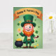 This card shows a cheerful leprechaun standing front and center in an emerald green suit and tall hat with a gold buckle, giving a friendly wink that feels like he’s sharing a secret with you 💚. His bright orange beard frames rosy cheeks and a wide smile, adding a cozy, buddy-like warmth to the scene. The background is a soft green gradient that glows behind him, with small shamrocks drifting around like confetti ☘️. Gold coins are scattered through the air, and a dark pot to his left is packed with more coins, making the whole setting feel lucky and lively. In his right hand he holds up one large gold coin as if offering it to a friend, while his left hand rests on a brown pipe. Near the top, an amber banner stretches across the card with the words “Happy St. Patrick’s Day” printed clearly in a darker contrasting tone. The banner sits above the leprechaun’s hat, and the shamrocks and coins continue to float around the green backdrop.