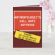"Les anthropologues sortiront n'importe quoi" est une plaisanterie bien connue pour n'importe quel anthropologue, étudiant en anthropologie ou enseignant, en particulier dans le domaine de la bioanthropologie, mais ce dessin humoristique et minimaliste aux tons rouges et jaunes colorés ajoute l'avertissement important "avertissement : le processus peut être destructeur", car plusieurs méthodes de datation nécessitent la destruction des échantillons sur lesquels elles sont utilisées... et, d'un autre côté, rencontrer un anthropologue peut être une expérience très difficile. Vous serez peut-être contraint de passer votre temps libre dans un musée ou de faire des randonnées sur un site archéologique au milieu de nulle part, par exemple ! Cette drôle de carte de voeux colorée est une bonne idée pour tout ami anthropologue, parent ou partenaire ;)