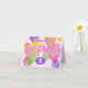 Une carte d'anniversaire amusante et colorée pour un jeune boulanger biscuit, avec le nom "Sophia" épelé dans des biscuits découpés roses disposés de façon réaliste et dépoli sur le devant de la carte entouré de ballons multicolores - message intérieur et âge de l'enfant sur le devant peuvent être personnalisés - deux biscuits découpés en forme de ballon accent l'intérieur de la carte - arrière - plan est un motif pois sur rose pastel message moi pour les demandes de nom personnalisé - par katz_d_zynes