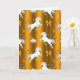 Une carte de Noël licorne dorée brillante présentant un motif de licornes, gambadant sur un fond doré magique. Elles ont toutes des cornes dorées, des cloches en or autour du cou et traînent une traînée d'étoiles dorées. Elles sont entourées de petits nuages de licorne kawaii avec des cornes en or, des rubans de Noël en or, de petits sapins de Noël dorés et un peu de poussière d'étoiles blanche en arrière-plan. Cette carte de Noël licorne serait une carte de vœux idéale à envoyer aux personnes qui aiment les licornes, la magie et la fantaisie pour Noël.