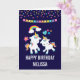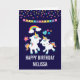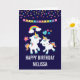 Une carte d'anniversaire avec 2 licornes mignonnes dansantes aux queues et crinières brillantes et colorées. Un arc-en-ciel coloré avec des nuages de chaque côté au-dessus de leurs têtes. D'autres éléments incluent une petite fleur, un cœur et quelques étoiles. Fond violet foncé. Points de confettis colorés et une image de banderole triangulaire le long du haut.