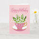 Un petit teacup rose pittoresque rempli d'un beau bouquet de lis de la vallée fleurit avec les mots lettrés à la main Joyeux Anniversaire sur le dessus de la carte et les mots lettrés à la main 72 aujourd'hui avec le coeur d'amour sur la tasse de thé. Une belle carte d'anniversaire pour quelqu'un qui a 72 ans aujourd'hui !