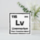 This design features a bordered square mimicking an element tile, with the atomic number "116" at the top left, atomic mass "293" at the top right, the symbol "Lv," the full name "Livermorium," and the classification "Post-Transition Metal" underneath. It’s fun for scientists and students because it playfully celebrates the superheavy, synthetic element Livermorium, turning obscure nuclear-physics trivia into wearable geek chic. It also signals insider pride in the quest to expand the periodic table.