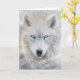 Bonnes Fêtes pour les vacances de Noël avec un magnifique loup blanc encadré dans une scène hivernale enneigée. Ses yeux bleus percevants se démarquent magnifiquement contre les tons doux et muets.