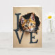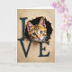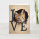 This card shows a Bengal cat peeking through a torn round hole in brown paper, as if it just popped in to say hello. The cat’s face is front and center, with bright green eyes that look curious and sweet. Its fur is golden-brown with darker swirls and spots, and you can see a pink nose and long white whiskers. Behind the cat is a dark opening that makes its face stand out clearly. The ripped paper edge looks rough and uneven, adding a fun “breaking through” feel. Near the bottom, you can partly see the letters “V” and “E” from the word “LOVE” in dark, thick letters. It feels like love is showing up in a surprising, cute way 💘😘. Hope it helps you share a little extra love on Valentine’s Day with someone who matters ❤️.