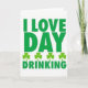 This card features the phrase “I LOVE DAY DRINKING” in large, all-caps sans-serif letters, stacked across three lines for a confident, flirty wink between friends 💚. “I LOVE” sits at the top in emerald green, like an opener that sets the tone without taking up too much space. The word “DAY” is centered and much larger, anchoring the design the way someone might lean in closer to make a point. Between “DAY” and “DRINKING,” four small shamrocks form a neat horizontal row, adding a cheerful St. Patrick’s Day nod ☘️. “DRINKING” runs along the bottom in the same emerald green, stretching wide and steady to finish the message. Everything sits on a bright white background with lots of open space, keeping the focus on the words and the shamrocks. The shamrocks are a light lime green, evenly spaced in a straight line beneath “DAY.”