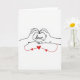 This card shows two simple black-outlined hands reaching toward each other and touching at the fingertips to form the shape of a heart. Inside that heart shape, the word “love” appears in a smooth, flowing black letter style, centered between the fingers. The background is plain white, so your eyes go straight to the hands and the message. Near the bottom, a red thread runs across the card in a gentle wave, like a line connecting moments together. Three textured red hearts sit along that thread, with one larger heart in the middle and two smaller ones on either side. The hands and the red hearts together feel like a quiet promise of care, making it meaningful for a partner or a close friend 🥰❤️. It’s an easy way to share Valentine’s Day sentiments with someone you care about.