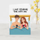 This greeting card shows a sweet couple tucked into bed under a teal blanket, with a warm wooden headboard behind them. The man has neat brown hair, and the woman has long auburn hair, and both have slightly rosy cheeks and small, relaxed smiles. Each of them is holding a smartphone, which adds a real-life touch while still feeling caring and close. The background is plain white, so the teal bedding and the woman’s red camisole stand out right away. At the top of the card, the words “I LOVE SPENDING TIME WITH YOU” appear in a handwritten script style, set in dark lettering across the upper area. The message pairs nicely with the scene, showing that being together matters even when you’re doing your own thing. It’s a calm, affectionate design that fits romance or close friendship, with a cozy feel ❤️💌.