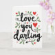 This greeting card features the words “love you darling” in flowing black lettering across a bright white background. The phrase sits centered on the front, with “love” above “you,” and “darling” below, so your eyes move through it easily. Small red hearts are sprinkled around the words, and one heart replaces the dot over the “i” in “darling.” Another heart appears above “you,” with a thin arrow pointing toward it, which makes the message feel direct and tender. Slender green leafy sprigs curl around parts of the lettering, along with a few tiny red berries that add a gentle pop of color. The mix of black text, red hearts, and green leaves feels romantic and caring without being over the top ❤️. It’s a meaningful card to give because it says what you feel in a simple way and still looks special 🥰, making it easy to share Valentine’s Day sentiments.