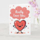 This card features an anthropomorphic red heart character centered low on a bright white background, beaming with wide sparkly eyes, a big smile, and rosy cheeks that read like a shy crush 🥰. Small arms and legs extend from the heart, with one little hand raised in a friendly wave that feels like an eager hello. Above the character, a soft coral speech bubble floats near the top half, adding a gentle, romantic focus ❤️. Inside the bubble, the words “Really Love You” sit neatly in the middle in a friendly, rounded lettering style, colored to match the coral tone. Around the heart, tiny coral dots are sprinkled like confetti, keeping the space airy while hinting at excitement. Within the speech bubble, small white starburst shapes add sparkle and a light, dreamy touch. The overall layout stays simple with lots of open white space, coral accents, and the red heart character anchoring the lower portion of the design.