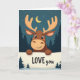 On the front of the card is a friendly cartoon moose peeking out from a snowy forest at night. The moose has light-brown antlers, a rounded snout, dark shiny eyes, and a right-eye wink with a small half-smile. A soft pink blush on its cheek makes it look a little shy, like it’s letting you in on a sweet secret 🥰. In front of the moose is a white banner, and the words “LOVE you” are written across it, with “LOVE” larger and “you” smaller in a smooth, cursive-style look. The sky behind is deep indigo with a crescent moon and scattered stars, and dark pine trees stand in the background over gentle hills of snow. It feels calm and cozy, like a quiet moment shared with someone you care about. Giving this card says “I’m thinking of you” in a simple, affectionate way that works for romance or close friendship ❤️, and it’s a lovely way to share Valentine’s Day sentiments.