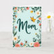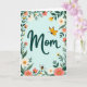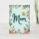 Designed with a soft pastel blue background, the card centers the word “Mom” in deep forest green lettering that gently curves across the middle ❤️. Around the edges, a garden-like border of leafy greens and winding vines wraps the design, giving the layout a close, caring embrace. Cream, peach, and sunny yellow flowers dot the border, like little gifts placed all around her name 🌼. The green text sits open and uncluttered in the center, while the floral frame stays mostly to the outer margins so the message remains easy to spot. A small yellow-winged insect drifts near the upper right, angled as if it’s floating toward the center with a friendly, affectionate pause. Near the lower middle, a striped pollinator hovers close to the greenery, as though drawn in by the blossoms and the gentle attention of the scene. Fine petal shapes and subtle wing markings add texture, and the border forms a continuous ring of leaves and blooms around the perimeter.