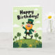 This greeting card shows a cheerful leprechaun in a cartoon style, standing on a rolling green hill with a friendly, welcoming stance that feels like he’s greeting someone close 💚. He wears an emerald coat and a tall hat with a buckle, paired with yellow-and-green striped socks and shiny black shoes. His bright orange beard frames rosy cheeks and wide eyes, and his open grin gives him the look of a pal leaning in for a laugh. In one hand he lifts a three-leaf clover ☘️, while the other arm stretches outward as if inviting a hug or a high-five. Above him, the words “Happy Birthday!” sit near the top in rounded black lettering that stands out against the pale green sky. The background fades from light to slightly deeper green with soft white clouds drifting behind the text. Along the bottom, small shamrocks and little yellow flowers dot the hillside in front of the leprechaun.