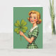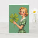 Designed with a retro advertising look, the card features a smiling blonde woman shown from the waist up against a solid deep-green background 💚. Her head tilts slightly as if she’s leaning in to share a friendly secret, with rosy cheeks, bright green eyes, and a wide grin that feels welcoming. She wears small white pearl earrings and a green-and-white gingham dress with a crisp white collar and tiny green buttons, giving her a neat, classic look. In her right hand she holds a large four-leaf clover ☘️, angled toward the viewer like a sweet little offering. The lighting is even and bright, keeping her features sharp and the colors smooth with almost no shadow. Any greeting text sits at the top in white, with a short line near the bottom in a lighter green that echoes the dress details. The clover’s four leaves are carefully shaped with clear veins, standing out in darker green against the flat background.