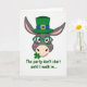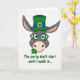This card shows a cartoon donkey’s head centered on a bright white background, dressed up for St. Patrick’s Day with an emerald green top hat and a small gold buckle. Matching green-rimmed glasses frame its expressive eyes, and a soft blush sits on its cheeks as it gives a slightly flirty, upturned smile 💚. A four-leaf clover rests gently between its lips ☘️, like it’s offering a lucky kiss to someone just off to the side. The simple, open space around the character keeps all the attention on its face and festive accessories. Near the bottom, the phrase “The party don't start until I walk in…” is placed in green lettering, standing out clearly against the white. The artwork uses smooth, crisp lines and solid color fills, keeping the look neat and easy to read. The hat’s green dominates the top of the design, while the clover and glasses echo that same green tone around the donkey’s mouth and eyes.