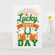 Made to share a festive St. Patrick’s Day scene in emerald green and warm orange, set on a white background with soft, subtle stripes. At the top, the word “Lucky” appears in flowing green lettering, with orange rays and a small shamrock beside it, like a cheerful wink between friends 💚. Near the middle, “EVERY” sits on a curved orange banner, trimmed with tiny green shamrocks that feel like little confetti. Below that, “DAY” is written in sturdy green letters, giving the layout a grounded finish. Under the text, a green horseshoe with dotted details sits between two orange beer mugs, angled toward each other as if clinking in a friendly toast ☘️. White foam spills over the tops, adding a cozy, just-poured look that makes the moment feel shared. Small green shamrocks and star shapes are scattered around the mugs and horseshoe, filling the lower area with extra lucky details. Share St. Patrick’s Day sentiments with someone special, and notice the orange starbursts and tiny shamrocks sprinkled around the lettering and icons.