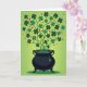 This design shows a dark, rounded cauldron sitting at the bottom center, its inky surface making the contents feel mysterious and inviting. From the opening, a fountain of four-leaf clovers bursts upward ☘️, their thin stems curving and crossing as they fill most of the card. The clovers shift through several greens, from deep emerald to softer spring tones, and their shapes stay crisp against a lime-green background that fades gently from lighter to slightly deeper color. Tucked among the leaves are small red hearts that float upward like they’re caught in the same lift, adding a quiet, affectionate spark 💚. The way the hearts weave between the clovers reads like a friendly flirtation, as if luck and love are chasing each other through the air. Near the top, the greeting text sits centered in a medium green, spaced so it doesn’t crowd the clover stems. The overall scene stays bright and airy, with the cauldron grounded below and the clovers and hearts rising into the upper corners.