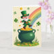 This card shows a smiling leprechaun in an emerald suit and tall green hat with a gold buckle, stepping up from a deep green pot that’s overflowing with shiny coins ☘️. He holds his arms wide as if greeting a close friend, his rosy cheeks and full white beard giving him an easy, welcoming look. At the bottom, bright green grass frames the scene, guiding your eye up through the spilling gold and toward the character’s cheerful face. The background is a creamy, light tone sprinkled with soft shamrock shapes, some crisp and some faded for a layered feel. A gentle pastel rainbow 🌈 curves near the top, adding a soft glow above the action. The greeting text sits near the upper area in green lettering that stands out against the pale background, leaving the leprechaun and gold as the main focus. Gold coins tumble in a curved stream from the pot’s rim, catching little highlights as they scatter across the center of the design.
