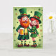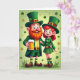 On the front of the card a cheerful pair of leprechauns stand close together, dressed in emerald green coats with gold accents and striped socks, sharing an easy, affectionate grin 💚. The man has a russet beard and rosy cheeks, and he lifts a foamy tankard of ale as if toasting the person reading. Beside him, the woman’s fiery red hair peeks out from under a matching green hat, and her hand rests lightly on his arm in a small, tender gesture of friendship. Soft, diffused light gives their faces a gentle glow, and the warm oranges in their hair and beard balance the greens. The background fades through pale green tones, keeping the focus on the couple while still feeling festive. A St. Patrick’s Day greeting appears near the top in green lettering, with a smaller line of text set below in a warm golden color, leaving open space around the characters. Scattered shamrocks and four-leaf clovers float across the pale green backdrop, with a few near the corners like little confetti ☘️.